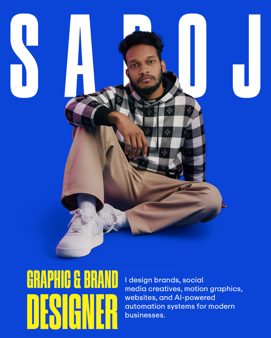 I’m Saroj Maharana, a Graphic Designer, Brand Strategist, and Motion Graphics Specialist from Odisha, India. I help businesses build strong brands, engaging social media content, motion graphics, websites, and AI-powered automation systems. I combine creativity with technology to create modern digital experiences for clients worldwide.